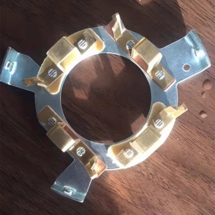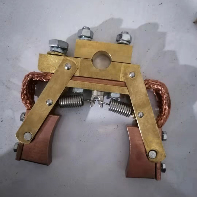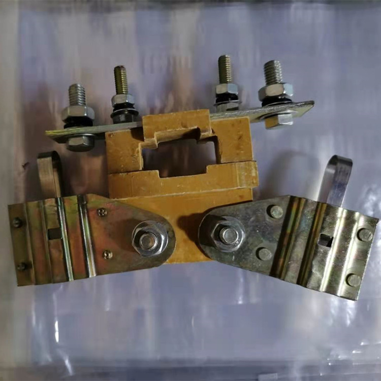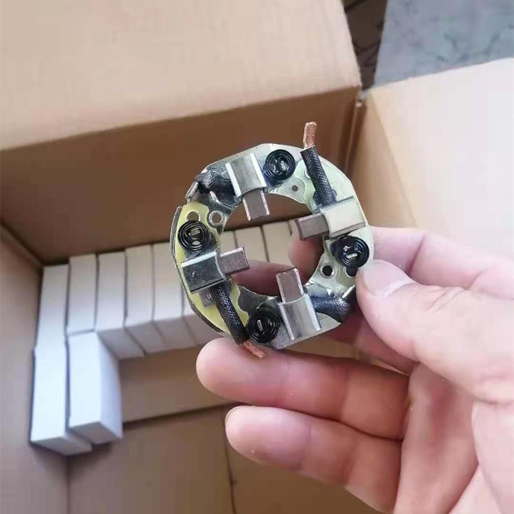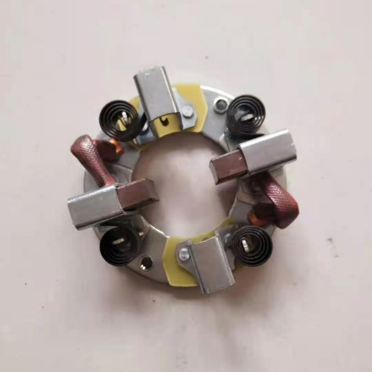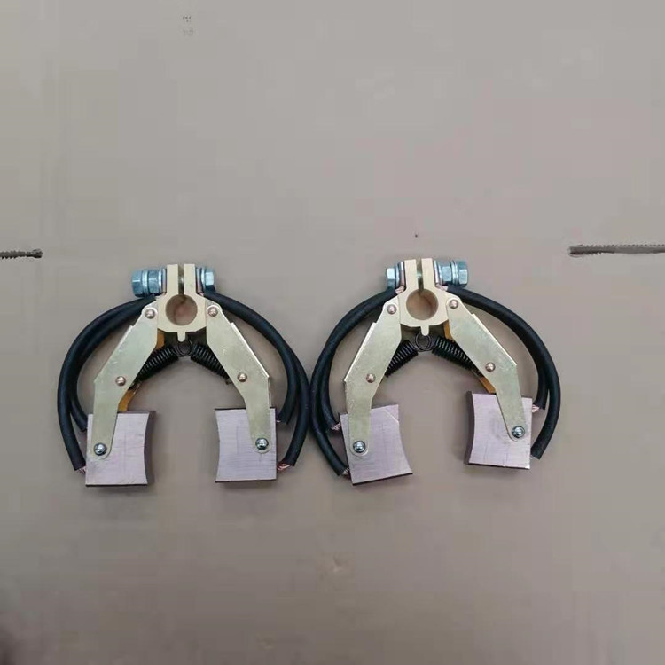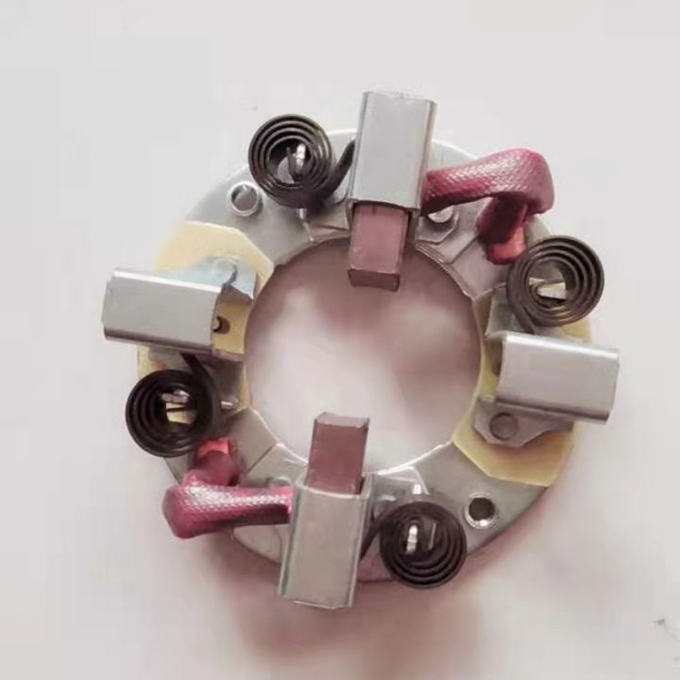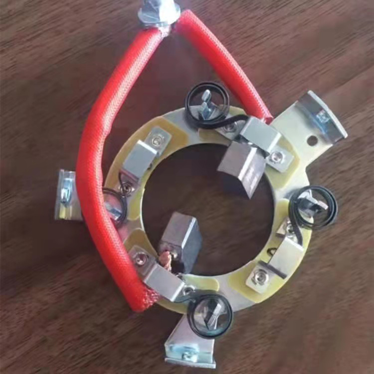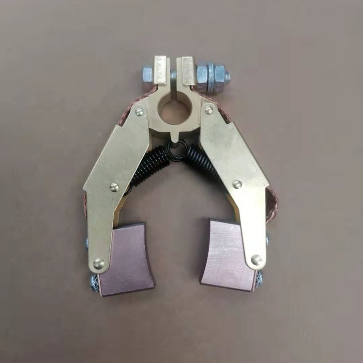 刷架的结构是保持碳刷在规置上的刷盒部分,用适当压力碳刷以防止碳刷振动的加压部分,连接刷盒和加压部分的框架部分以及将电刷架固定到电机上的固定部分组成。保持碳刷稳定、检查或换碳刷时,易于在刷盒内装卸碳刷、能调整碳刷在刷盒下的露出 部分(刷盒下端边缘与换向器或集电环表面的间隙)以防止磨坏换向器或集电环、碳刷压力的变化、加压方向和加压位置等对碳刷磨损的影响要小,且结构牢固。碳刷架主要采用青铜铸件,铝铸件及其它合成材料。要求刷架本身材料具有良好的机械强度,加工性能,耐蚀性能,散热性能和导电性能等。