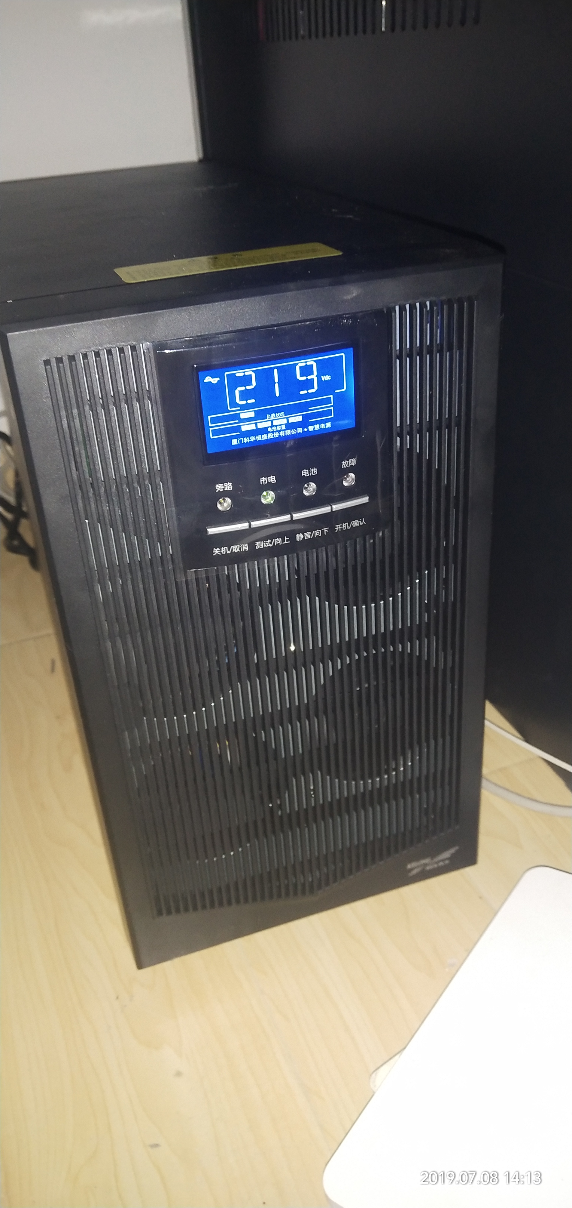 UPS的开机键为多功能键,关机时按开机键启动UPS,开机后若市电正常按开机键就可进行电池测试;若市电失败按开机键就实现蜂鸣器静音功能。