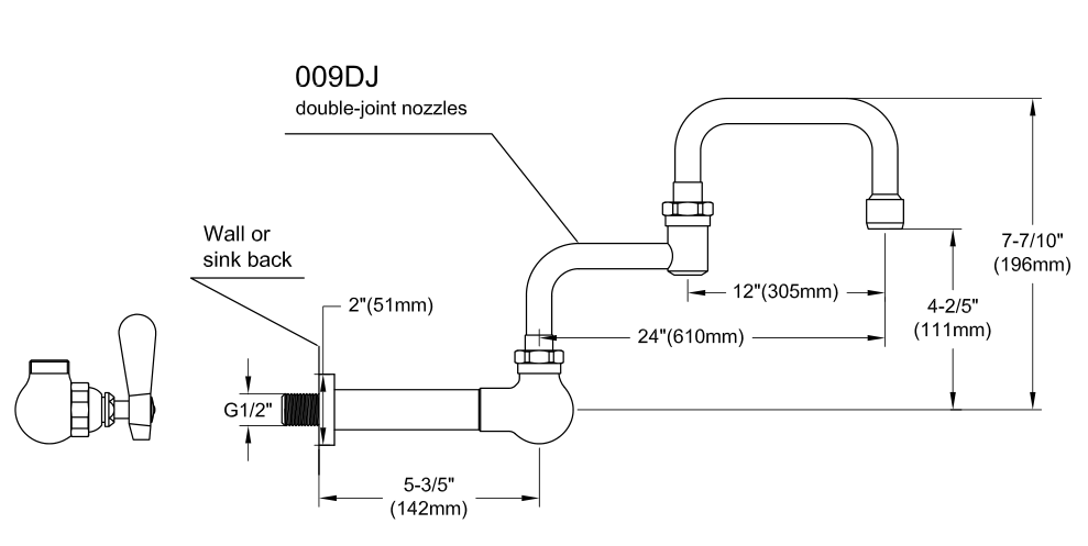 墙装冷热龙头,加长型双节摇摆管,更适用于厨房大型水槽