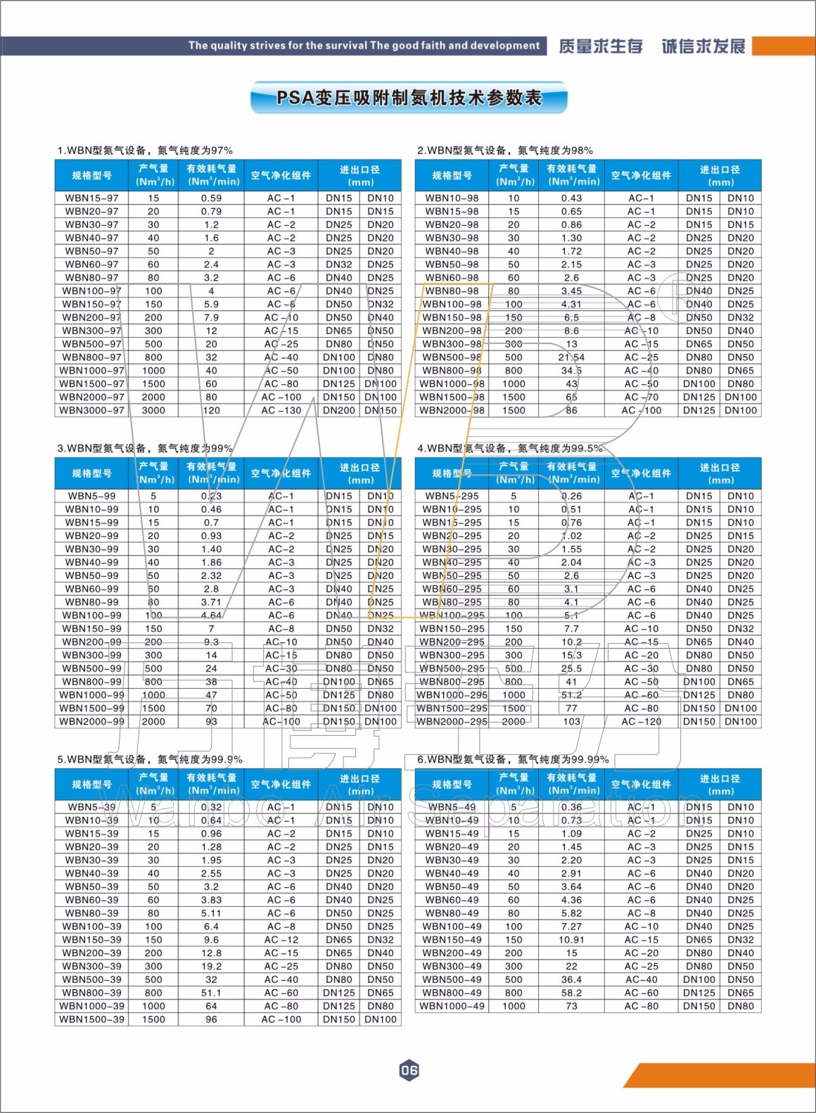 WBN系列变压吸附制氮机设备根据氮气纯度可分为八种型号,即:WBN97、WBN98、WBN99、WBN295、WBN39、WBN49、WBN59、WBN595。