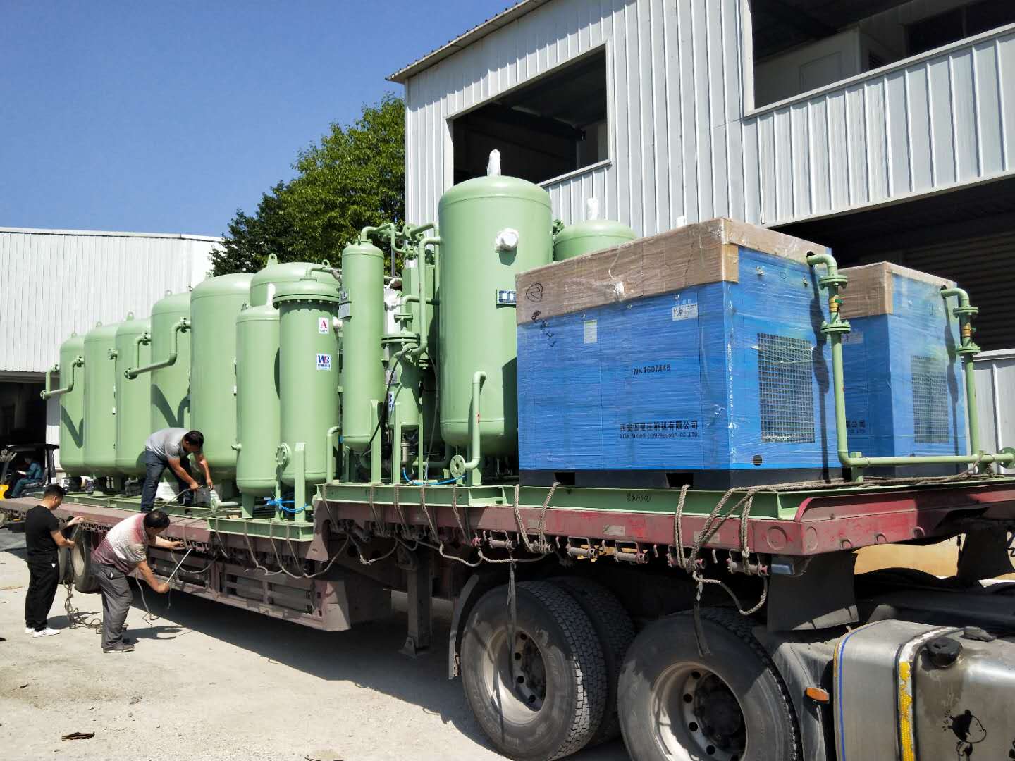 变压吸附制氮装置采用碳分子筛,其原理是利用压力变化来进行吸附与解吸,即让空气在一定压力下通过装有碳分子筛的吸附器,利用碳分子筛对空气中氧、氮的选择吸附性,使碳分子筛吸附其中的氧气,从而获得氮气;待吸附器内的吸附剂吸附达到一定饱和度后,降低其内的压力,使吸附剂在常压或负压下解吸再生,这样利用多个吸附器的反复循环,连续获得产品氮。
