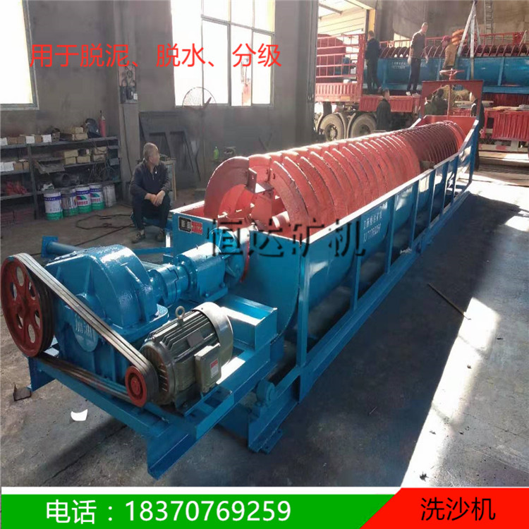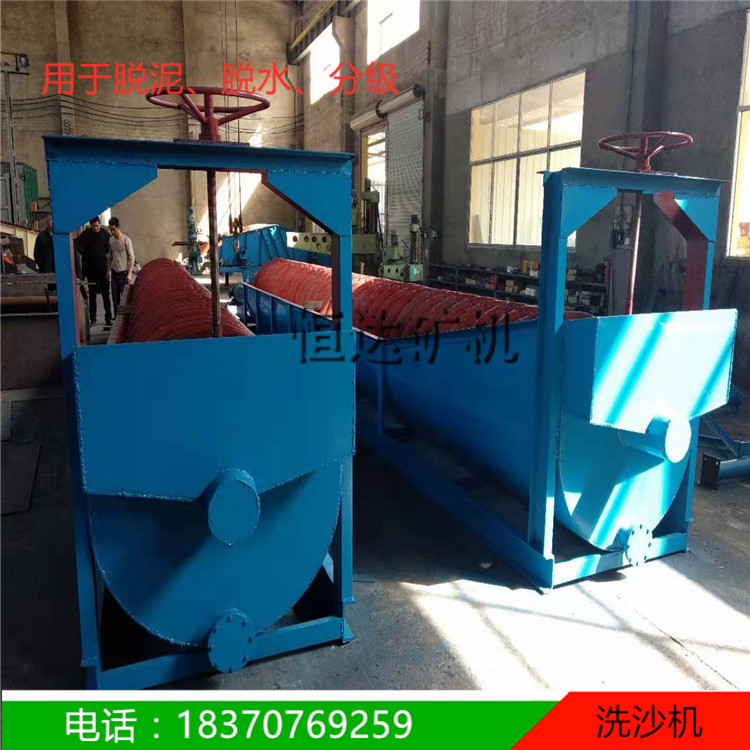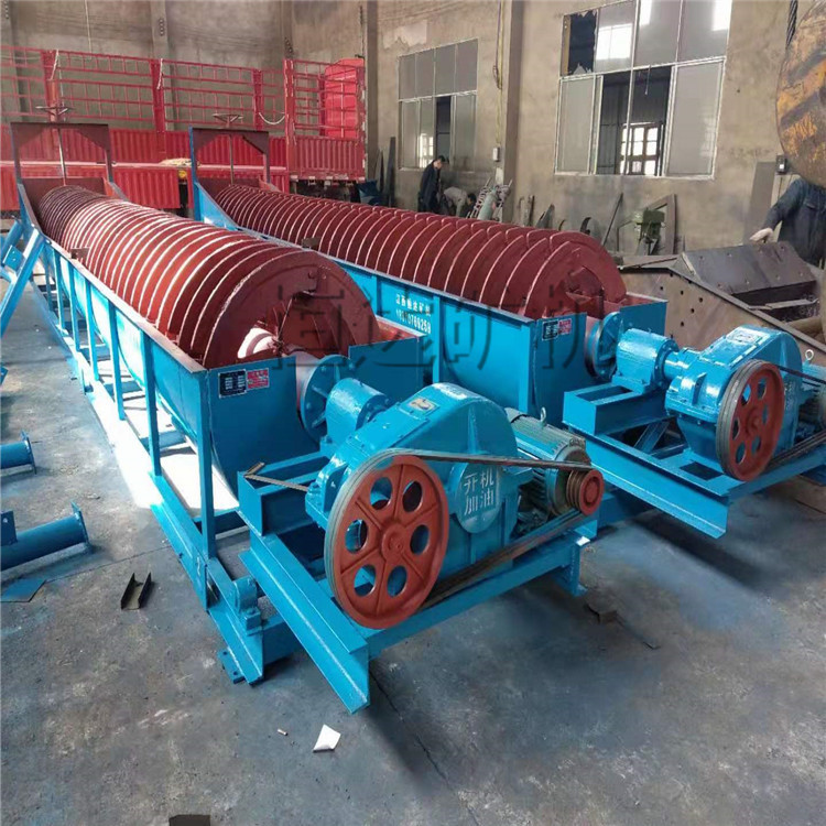 螺旋洗砂机又称螺旋洗沙机,由于螺旋洗砂机内部螺旋的数量不同可以分为单螺旋洗沙机和双螺旋洗沙机,单螺旋洗砂设备内部只有一个螺旋,双螺旋洗砂设备内部有两个螺旋。螺旋洗砂机主要用于制砂生产线中,是制砂生产线中的“清洗工”,主要用于将砂石中的泥土、粉尘等杂质除去,螺旋洗砂机对于小泥团的破碎分散能力强,清洗出来的砂石比较干净。