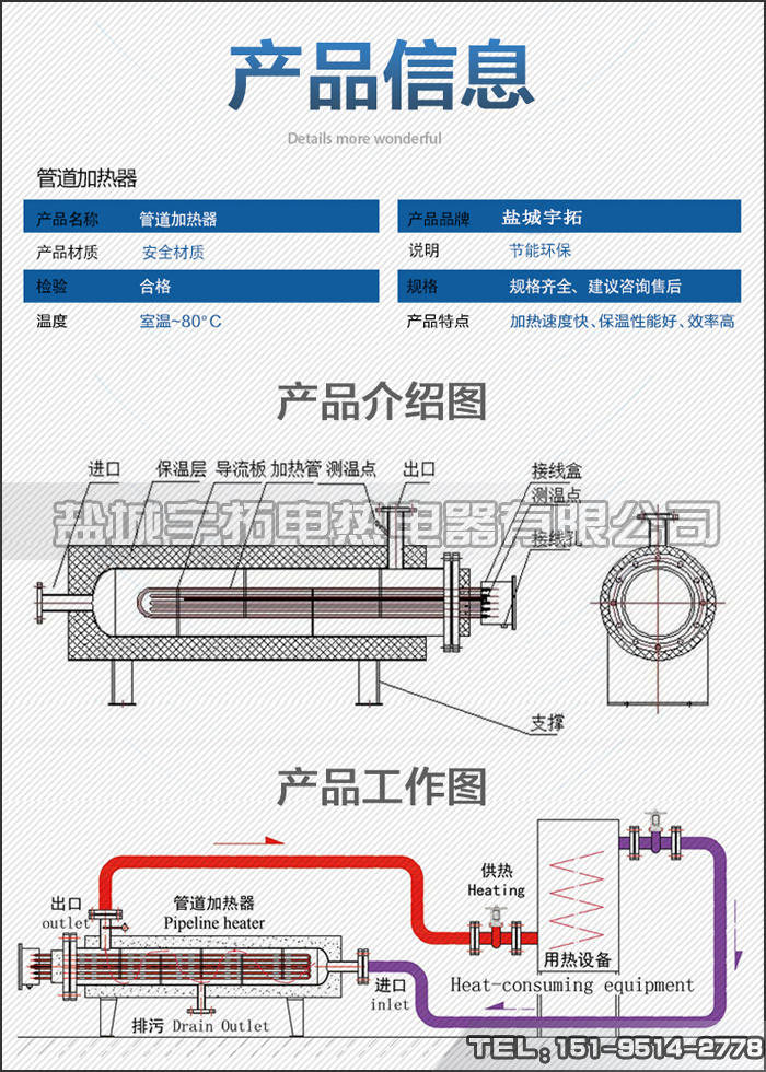 管道加热器(介绍)是一种对物质预先加热的节能设备,它安装在物质设备之前,实现对物质直接加温,使其在高温中循环加热作用, 终达到节约能源的目的。它广泛应用于重油,沥青,清油等燃料油的预先加热的场合。