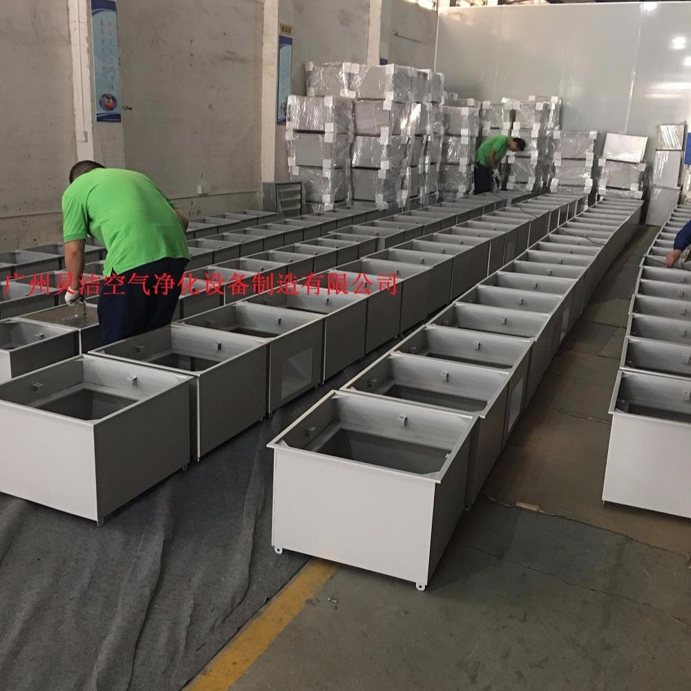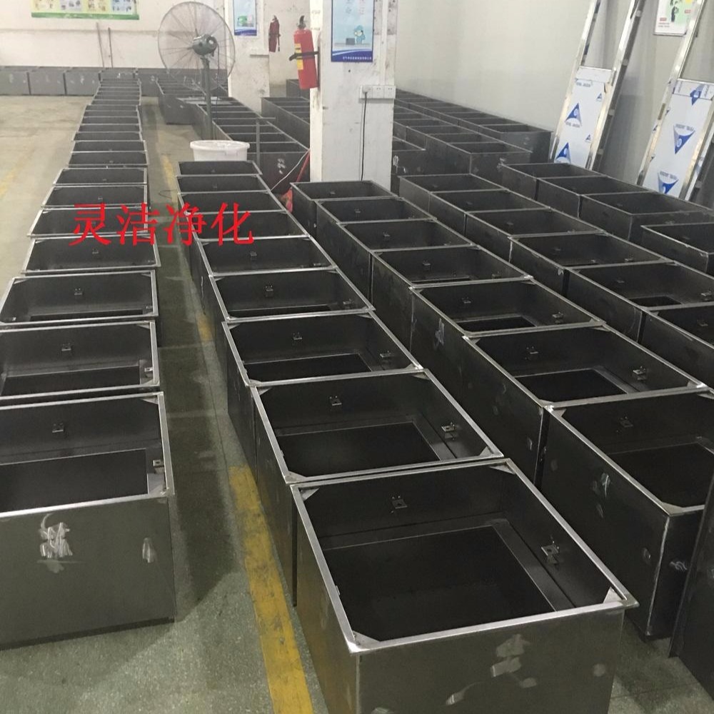 A、高效送风口静压箱体,材质有冷轧钢板(A3板)与不锈钢板。箱体是用作吊在天花上与四周库板相结合密封,也是高效送风口四件套主体。