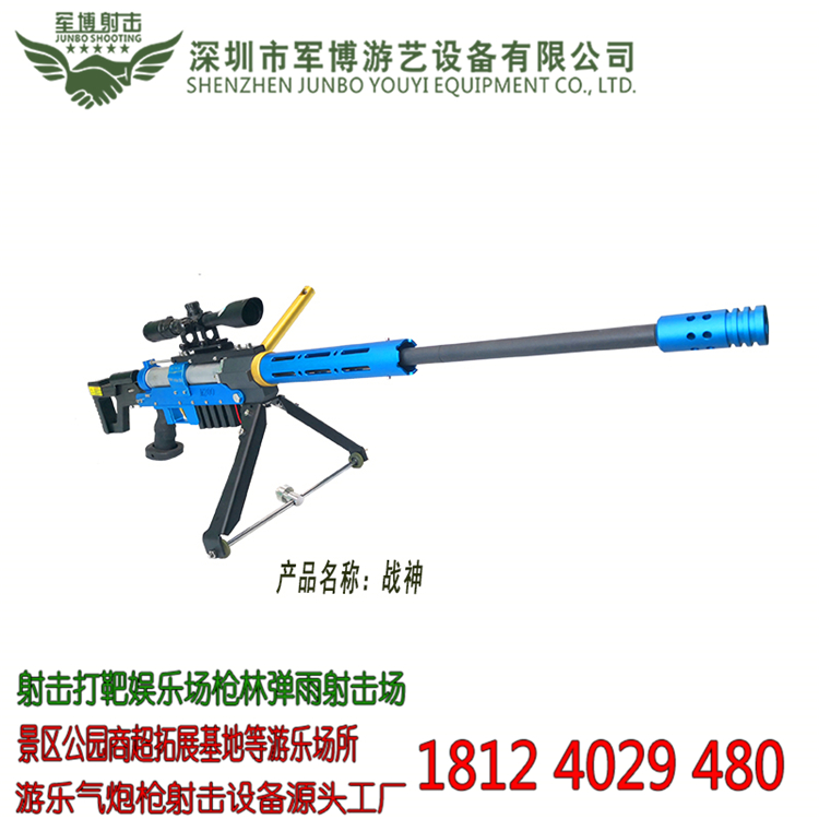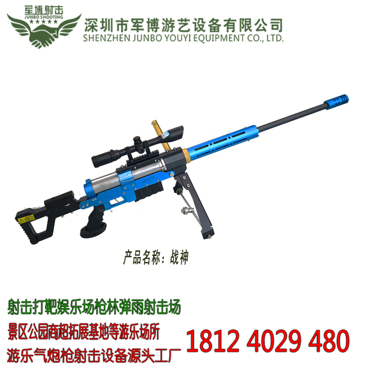 深圳智博生产的小型游乐设备游乐气炮战神气炮适用于旅游景区特色农庄游乐园公园等区域, 口径22MM。射程在4-8米, 利用空压机压缩输送气体发射橡胶球,五面做防护封闭式区域射击。