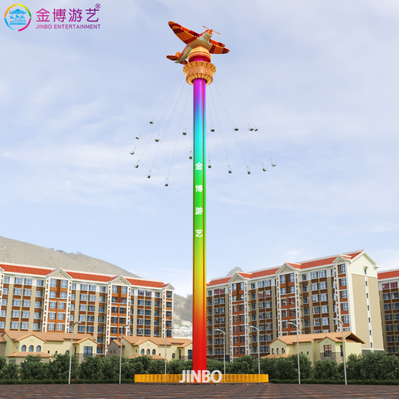 玩过跳楼机,高空飞翔,觉得已经调整无味了?来挑战一下金博游艺这款50米的高空跳伞吧,离地高度50米,在旋转上升的过程中逐步加速,快到顶端的时候设备将你瞬间推开座椅,悬挂空中,体验一把低空的跳伞感觉,当你的尖叫声还没有结束的时候,之间呼的一声,又已经将你拉回座位,开启俯视脚下美景的旋转模式。