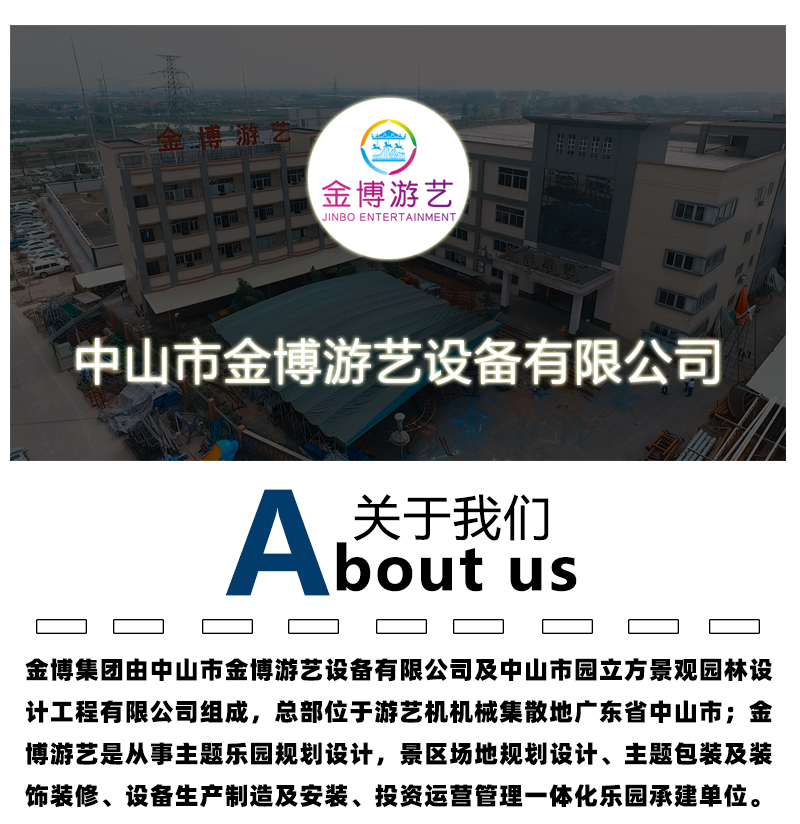 中山市金博游艺设备有限公司位于游艺机机械集散地广东省中山市,拥有40000余平方米现代化生产基地,金博游艺是从事主题乐园规划设计、主题包装及装饰装修、设备生产制造及安装、投资运营管理一体化的乐园承建单位。