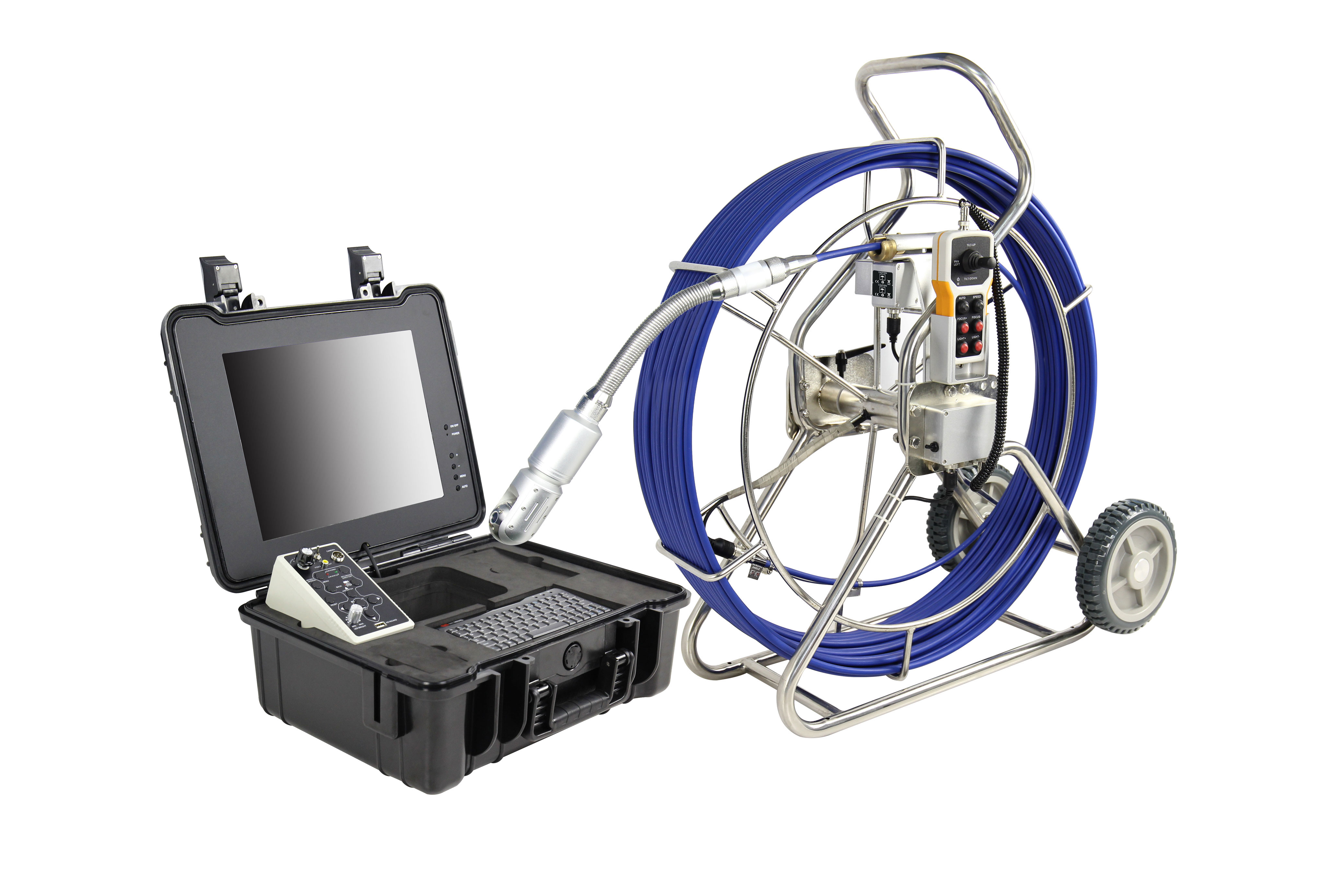 管道快速检测  管道潜望镜在检测过程中,客户可以选择采用有线或无线的方式将视频信号、缺陷位置信号传输到手持式控制控制终端上。客户可以通过管道快速检测  管道潜望镜触摸屏上的虚拟按钮,控制机头的俯仰,从而获得管道缺陷位置处的清晰图像信息;同时可以对缺陷进行编码和文字描述,并叠加字符到录制的视频文件中。
