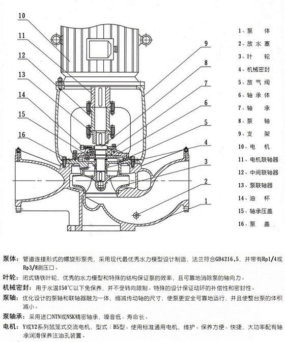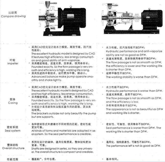 DFG系列管道离心泵是边立式结构,泵头一般采用铸铁HT200,铸铁HT250或者球磨铸铁QT、不锈钢SS304、不锈钢SS316和不锈钢SS316L几种材质制造,机械密封采用石墨对碳化硅、石墨对石墨,碳化硅对碳化硅还有合金对合金的机封,密封O型圈一般采用氟橡胶材质制造,叶轮泵轴等用根据泵头材质一样的材质。