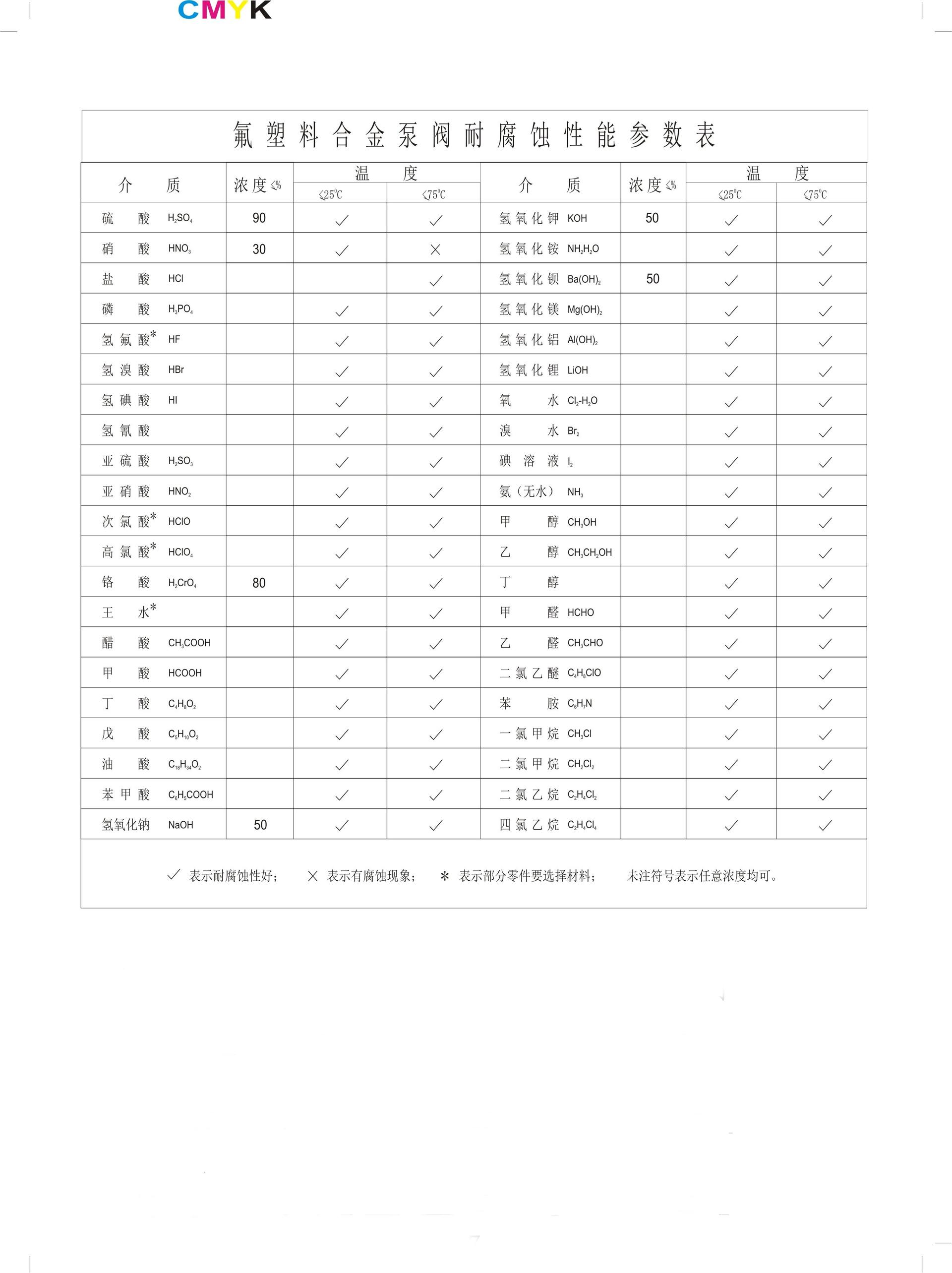 过流部分全部采用氟合金(聚四氟乙烯和聚全氟乙 等多种氟材料经过合理配方)模压、加工而成,具有较强的耐腐蚀性、机械强度高、不老化、无毒素分解等优点。