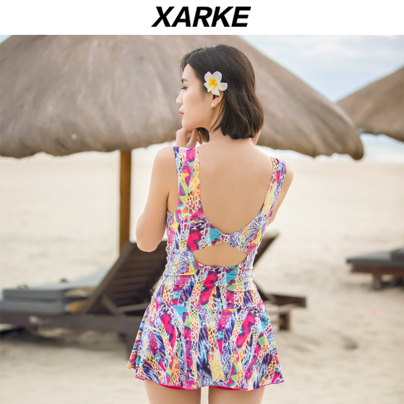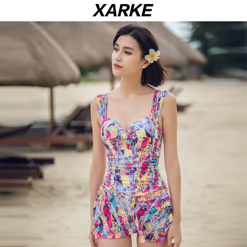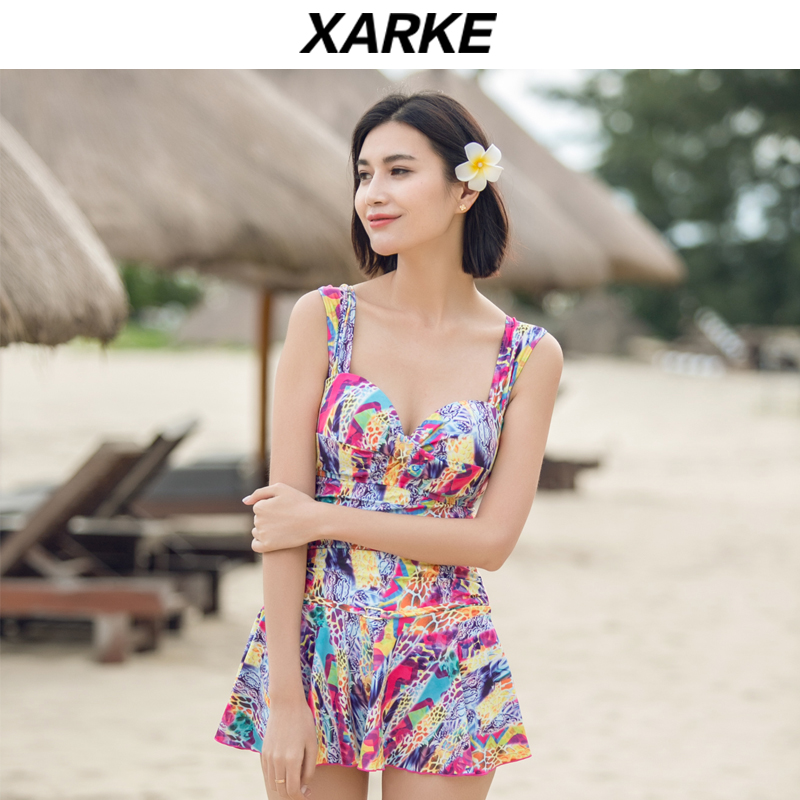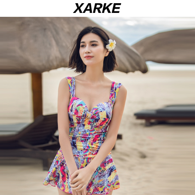 夏克泳衣女连体裙式花色时尚小胸聚拢遮肚显瘦游泳衣