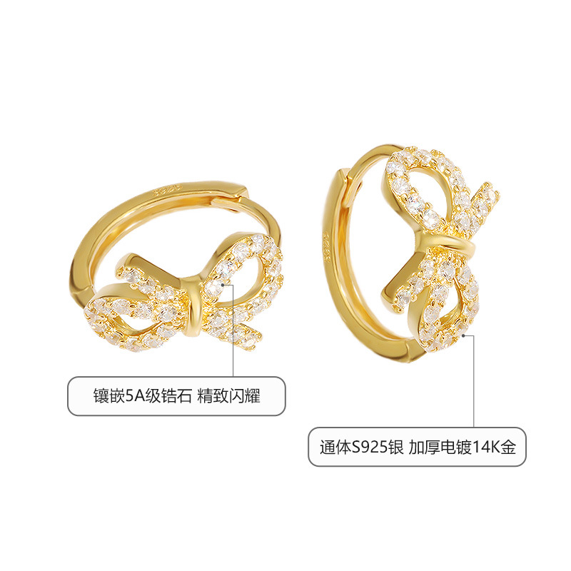 耳环925批发纯银镀K金耳扣女蝴蝶结锆石耳环高级感耳饰气质批发