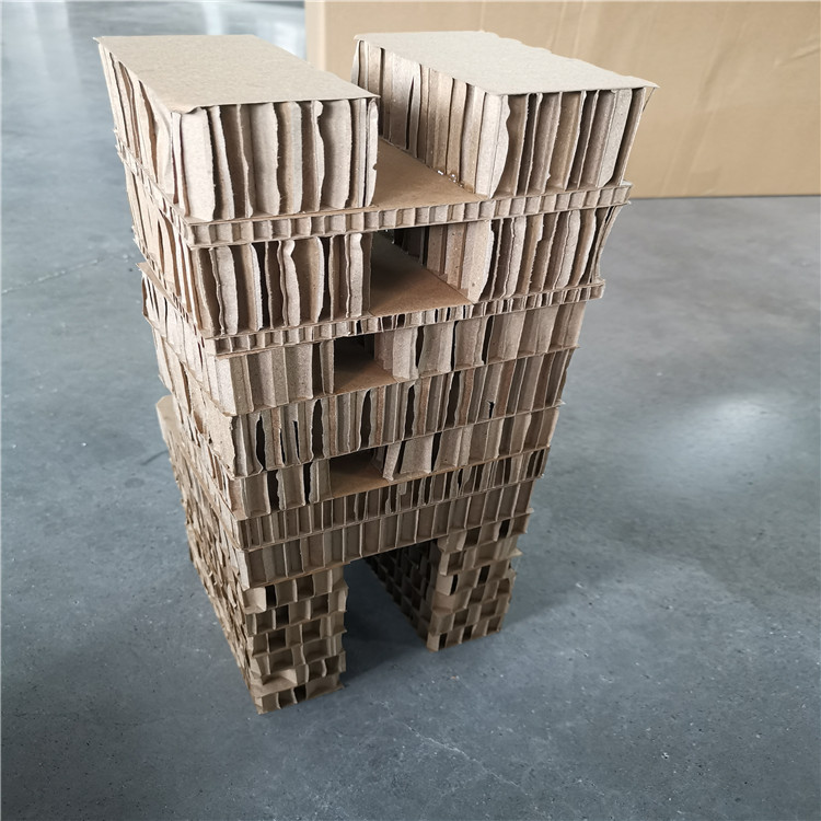 由于蜂窝纸板具有良好的平面抗压性能,因而它完全可以用于托盘中的上下铺板,也可用作托盘的纵梁或垫块。这时就要按纵梁或垫块的标准尺寸,由几