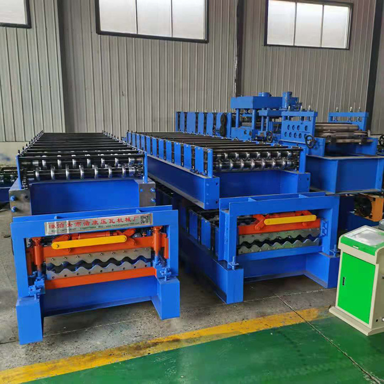 压瓦机技术参数 1.成型排数:9排/11排 2.电机功率:3Kw 3.油泵功率:3Kw 4.轴:45#钢,精车加工 轴径70 5.轮:45#钢,电镀硬铬 6.链轮链条:1寸 7.中板厚度:14mm 8.大架:300H 9.可压制板厚度:0.6mm 10.剪切方式:全自动液压剪切 11.电脑控制出版长度及张数。采用工业电脑台达PLC,国产变频器,信捷文本显示器,瑞普600线编码器,正泰、德力西及国外控制元件。