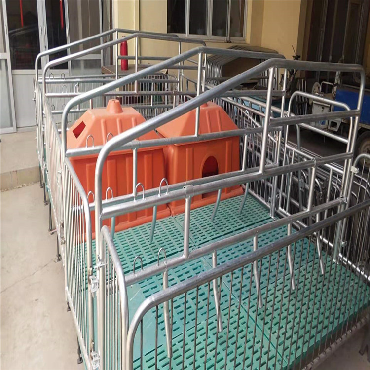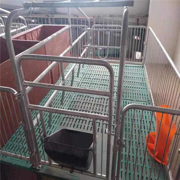 母猪产床又称高培产仔栏,主要由母猪定位架、仔猪围栏、仔猪保温箱、漏粪地板、母猪食槽和小猪补料槽等组成。 母猪定位架的作用是控制母猪自由活动区域和躺卧方式,母猪产床定位架之间有挡杠,避免仔猪被压死、踩死和压伤。定位架的长度一般为2.1-2.3米,宽度为0.6米,高度为1.0米。限位架下边的一根栏杆上面焊有弯曲的档柱,用以仔猪,而不影响仔猪吃奶。母猪食槽和饮水器都在定位架的前方。