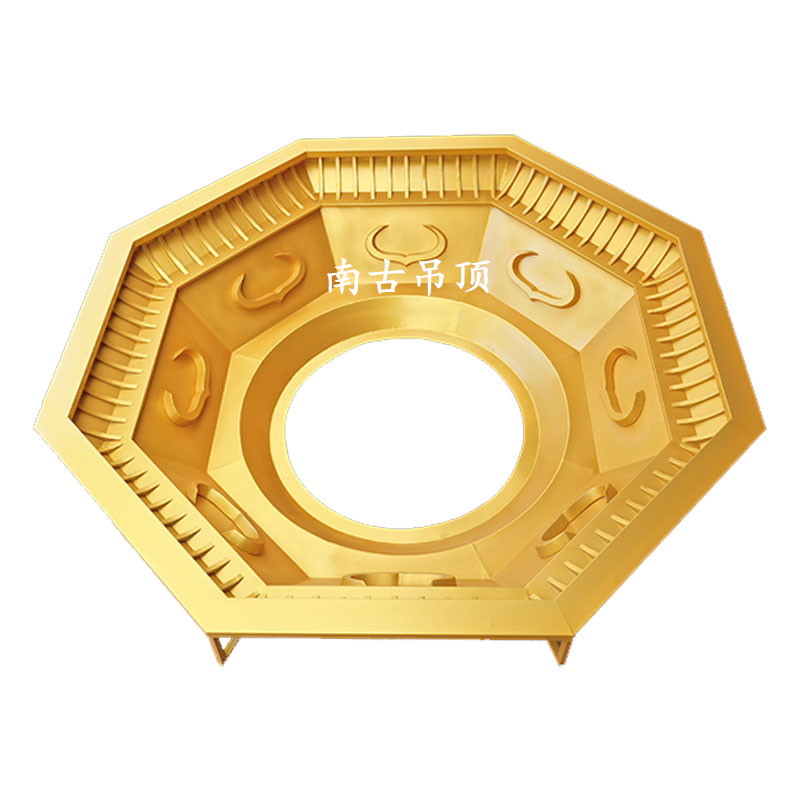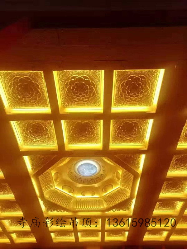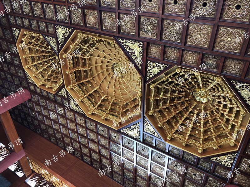 铝合金藻井,其表面喷刷氟碳漆,它的耐老化、抗腐蚀和防火防潮等性能尤为突出,而且铝合金在工艺上从开发模具到烘烤成型、直至 后安装有其严格的流程,使其更加安全有保障;在外观上构造精巧,造型美观,拥有自身独特魅力,很适合作为寺庙藻井的材质。