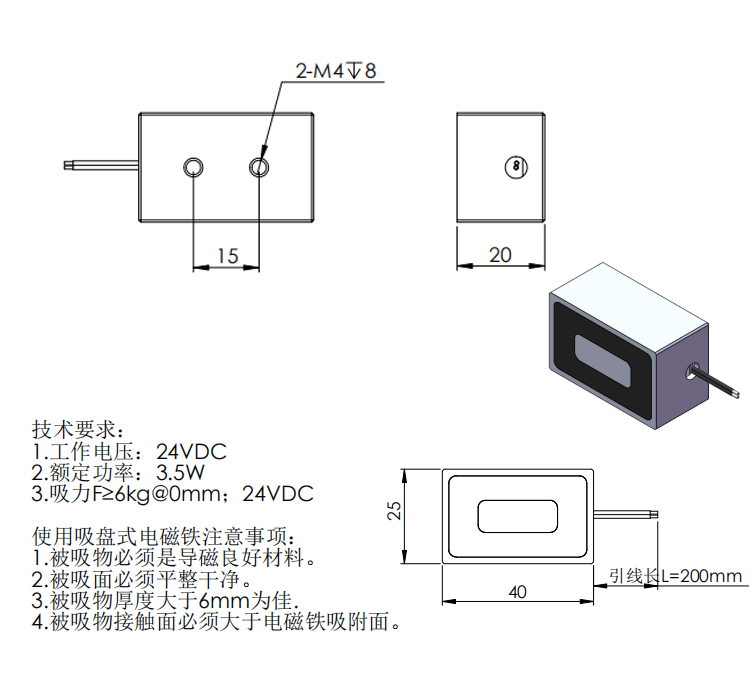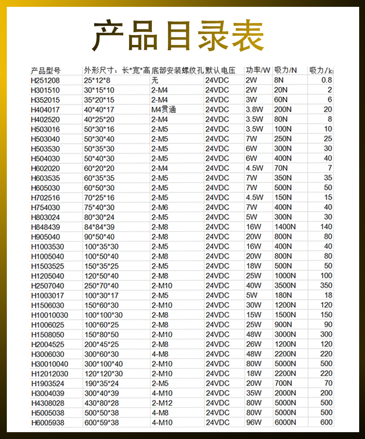 电磁铁通电就会产生力量,在相同功耗下,不同大小的行程位置力量的大小不同;在行程相同情况下,不同功耗力量也会不同;不同的功耗对应不同通电率(既是占空比)。通常规律是:⑴行程↑力量↓(⑵功耗↑力量↑。在电磁铁应用时,应考虑安全性能,即对力量的测试应是电磁铁在一定通电率下,温升稳定后所测得的力量即为电磁铁的力量,一般情况下,初始力量是温升稳定后力量的1.5倍左右。如产品的通电率很低(只有几次通断,而且时间非常短)则可将安全系数降低至1.2倍。
