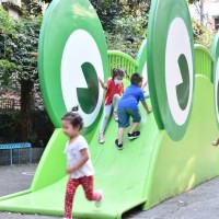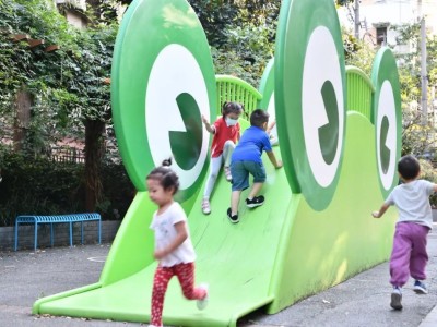 作为此次艺术季的新作,策展团队在狭小的社区街道引入了一个迷你“动物园”,希望在小场地也能够带来大地艺术的尺度感。因此,一个超级体量的青蛙王子从大地浮出,露出超大的眼睛环顾四周,熊猫宝宝也从另一侧爬出地面,四处张望,他们好奇地寻找社区的小朋友们,邀他们一起来玩耍。他们庞大的身体似乎掩藏在地下,无形中从视觉效果上拓展了社区空间的尺度想象力。这两个超级宽大的动物滑梯,可以一家人一起滑下,也可以很多小朋友手拉手一起玩。更多的小动物椅子在青蛙王子和熊猫宝宝的召唤下从草丛和树林中跑出来和社区的小朋友们玩成一片。