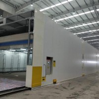 一种是侧进风(或房顶部)、侧排风。这种排风设计管道在房体之外,长度与整体移动房体的行程相同。外侧排风管道上设若干个电动风阀,而在房体侧面设置若干个喷漆或打磨工位,并在此处通过伸缩汽缸实现与排风管道的自动对接。漆雾收集采用玻纤地棉过滤,过滤棉框嵌入喷漆房墙体的排风一侧,而另一侧墙体或者房顶设置进风过滤系统。