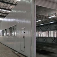 整体移动式喷漆间的设计目的,是为了满足较大型工件 打磨或喷漆的需要。一般情况下每套房体对应2~3个排风净化工位,哪个工位上的工件需要喷漆时,房体则行走移动到那个工位,其他工位可以继续打磨工作,待 房体内的工件喷漆完毕后,再控制移动房体行走到打磨完毕后的工件工位,如此设计可以实现大型工件的不间断连续喷漆工作。房体为钢结构构造,房体立柱下面设置有两台电动驱动行走机构,行走机构沿地面轨道行走。移动房体两端设置有电动卷帘大门,房体行走时,大门升起,待到达位置时,大门降落关闭。大门与行走机构由电气控制部分连锁控制,大门升起后,房体才可移动行走。
