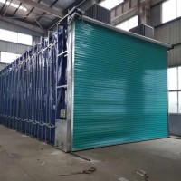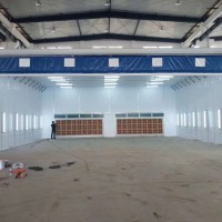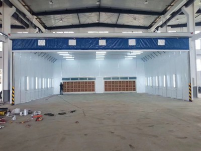 喷漆房后部采用防火岩棉夹芯板(可更换为镀锌板制作)作为底板,并合理设置多个吸风口,喷漆房内漆雾能有效进入后道废气处理装置。伸缩式喷漆房采用活动式框架结构,内衬玻璃纤维防火篷布,通过进出口门头处的驱动电机,通过轨道带动整体结构进行伸缩运动;非工作时间可将喷漆房整体折叠,节省了车间场地,作业时根据实际情况调节入口处卷帘,控制补风,从而提高作业时产生漆雾的回收效果。