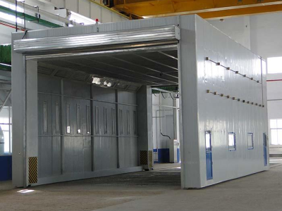 整体移动式喷漆房应用于大型工件的打磨或喷漆,方便收集工作中产生的粉尘或废气。在一般情况下每套房体设设置有2-3个排风净化工位,哪个工位上的工件需要喷漆时,房体则行走移动到那个工位,其他工位可以继续打磨工作,待房体内的工件喷漆完毕后,再控制移动房体行走到打磨完毕的工件工位,如此设计可以实现大型工件的不间断连续喷漆工作。房体为钢结构构造,房体立柱下面设置有两台电动驱动行走机构,行走机构沿地面轨道行走。移动房体两端设置有电动卷帘大门,房体行走时,大门升起,待到达位置时,大门降落关闭。大门与行走机构由电气控制部分连锁控制,大门升起后,房体才可移动行走。