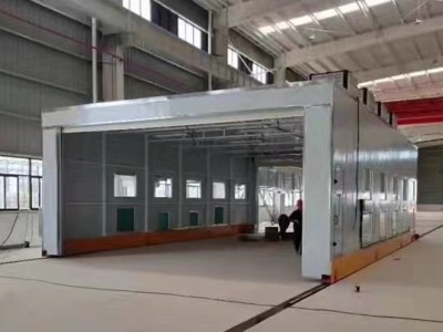 整体移动喷漆房的设计目的是为了满足磨削或喷涂较大工件的需要。一般每套对应2-3个排气净化站。当哪个工位上的工件需要喷漆时,房间移动到那个工位,其他工位可以继续抛光。当室内的工件涂漆后,控制移动室移动到抛光工件工位。这种设计可以实现大型工件的不间断连续涂装。房屋为钢结构,房屋的立柱下有两个电动行走机构,行走机构沿地面轨道行走。移动房两端安装电动卷帘门。当房间行走时,门上升,当房间到达位置时,门着陆并关闭。门和行走机构由电气控制部分连锁控制。门升起后,房间可以移动和行走。