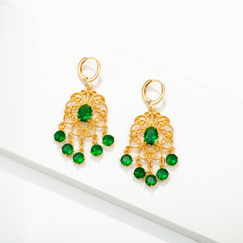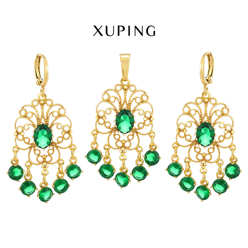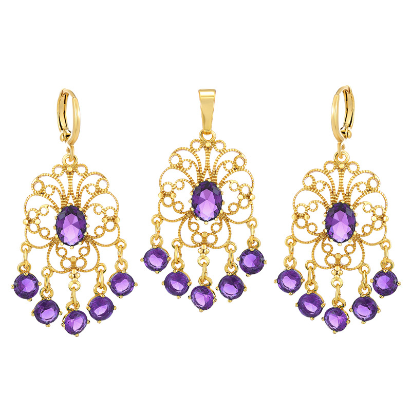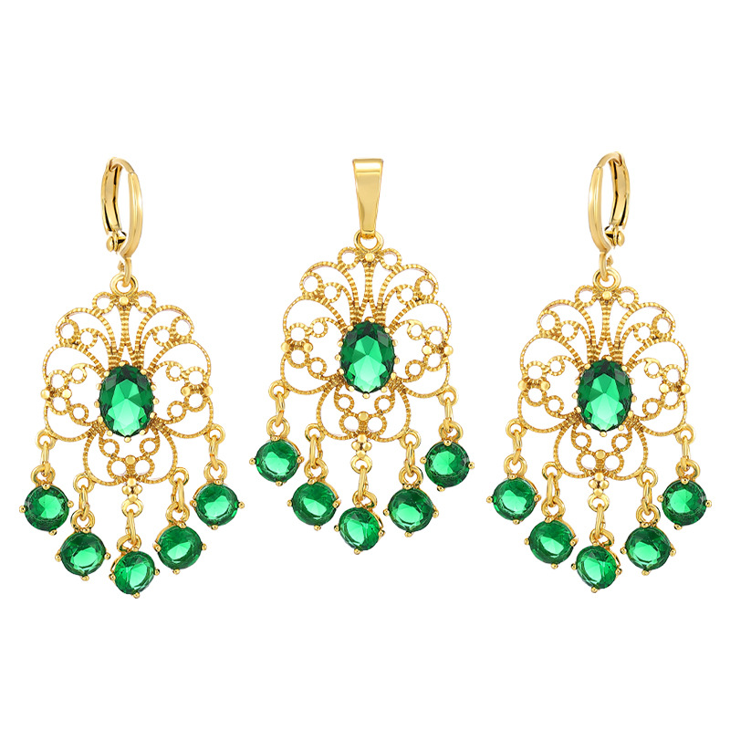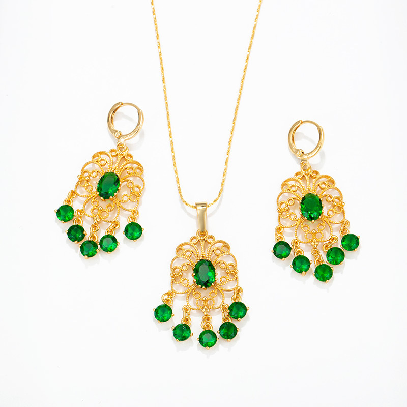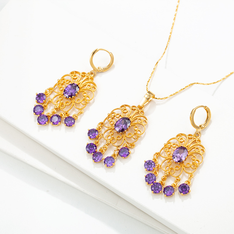 旭平首饰彩色复古宝石耳环项链套装女 法式优雅镀24K金色首饰套装