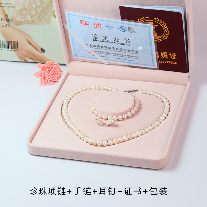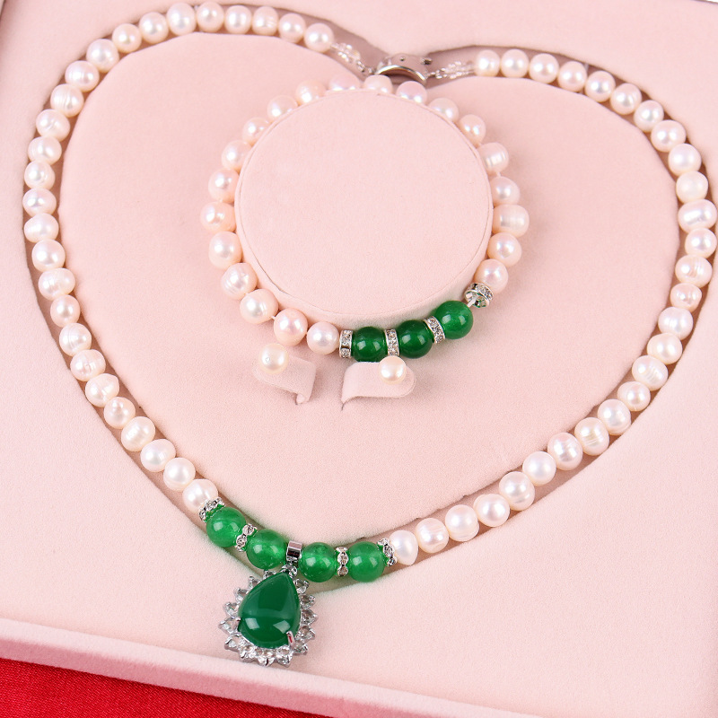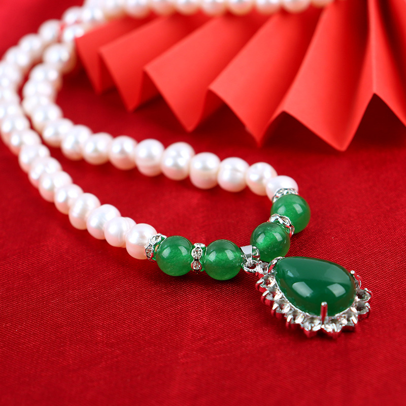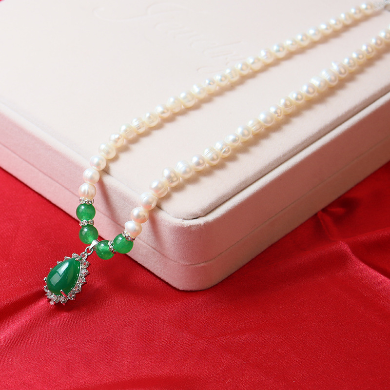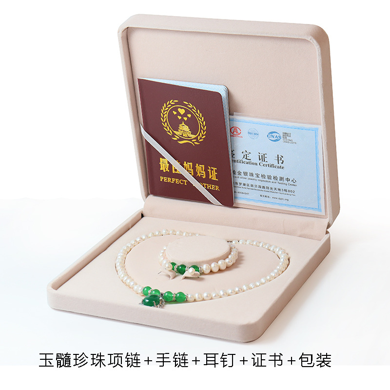 新款天然珍珠首饰套装 绿色玉髓吊坠证书包装 送妈妈礼物时尚项链