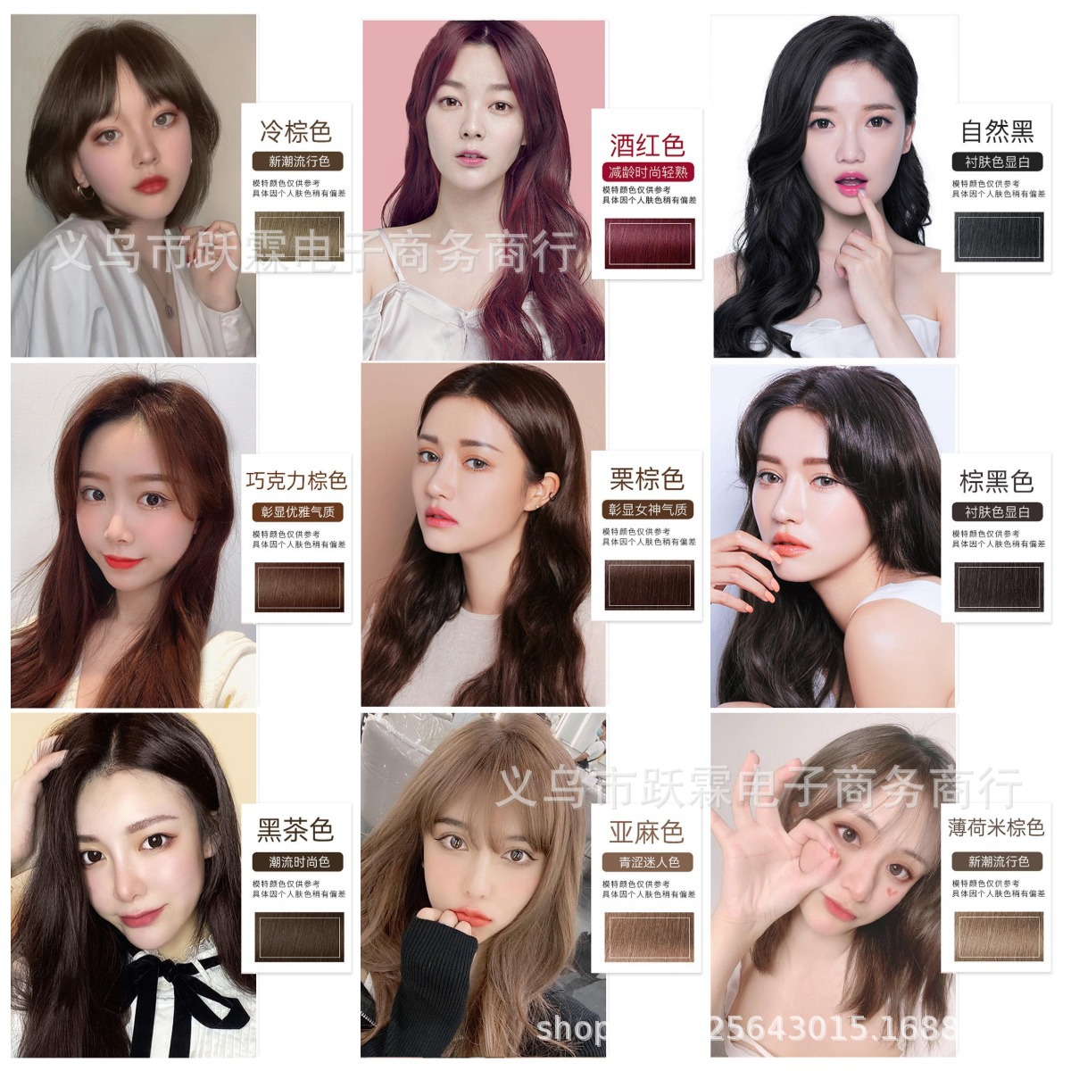 颜色酒红色 减龄时尚轻熟,自然黑 耐肤色显白,巧克力棕色 彰显优雅气质,栗棕色 彰显女神气质,棕黑色 衬肤色显白,黑茶色 潮流时尚色,亚麻色 青涩迷人色,薄荷米棕色 新潮流行色,冷棕色 新潮流行色,金棕色 减龄时尚色系,奶茶色 显肤色更活力,蜜糖醇棕色 青春百搭色